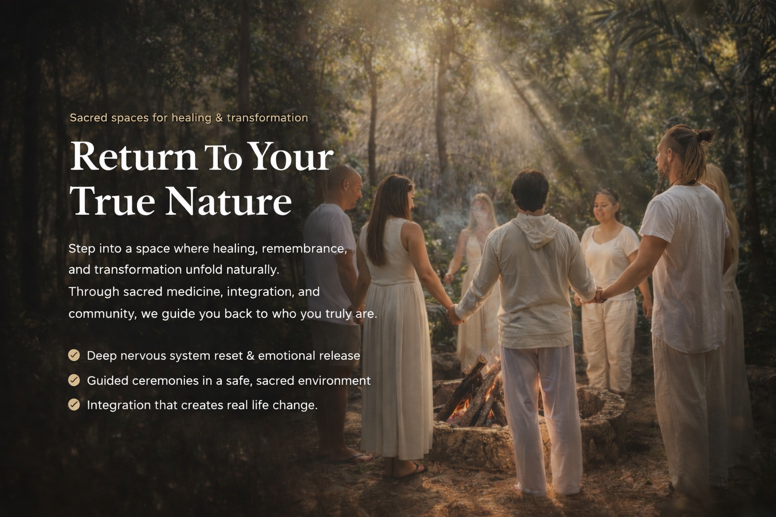 Our approach combines sacred plant medicines, nervous-system regulation, trauma-informed facilitation, and integration support. This creates meaningful and lasting transformation that continues beyond the retreat and into everyday life.